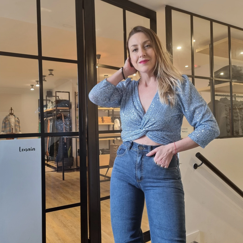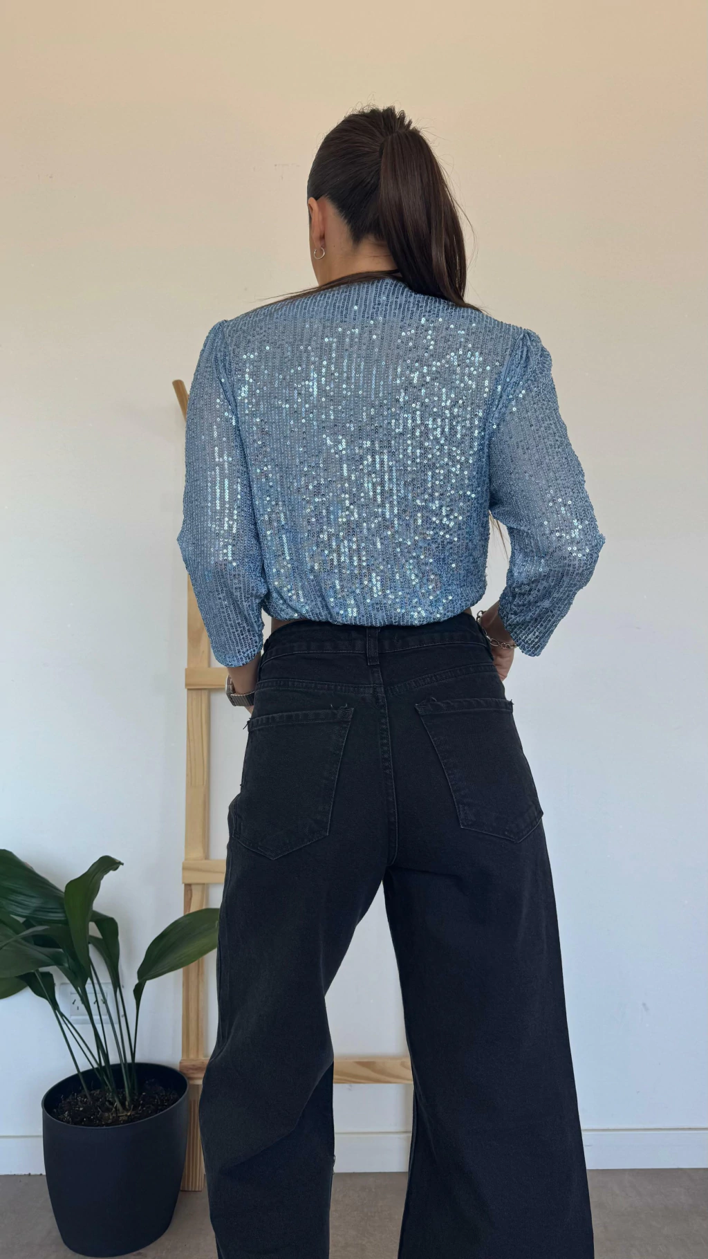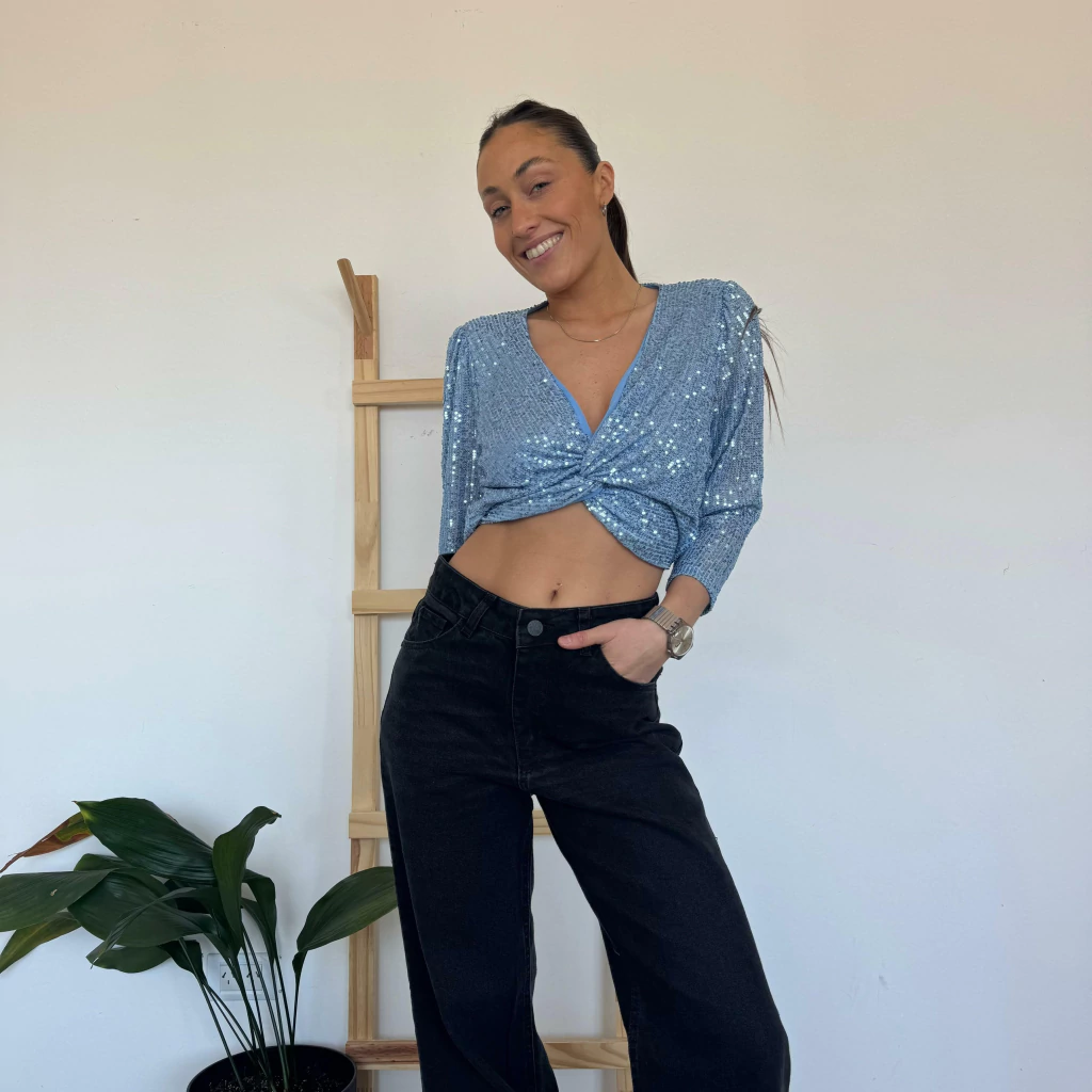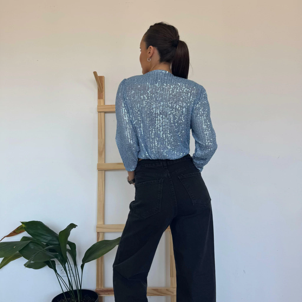 ¡Brilla con estilo! Blusa de lentejuelas, manga larga, con nudo y elástico en la cintura. Combina el brillo de las lentejuelas con el diseño moderno y femenino.