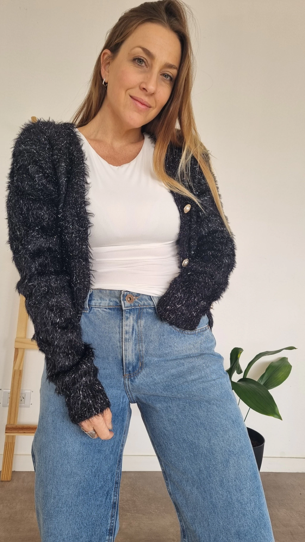 Descubrí el cardigan importado con botones dorados que transformará tus outfits. Confeccionado en un material de pelo de mono con lurex, ofrece un tejido sumamente suave con un delicado brillo que aporta sofisticación sin perder comodidad.