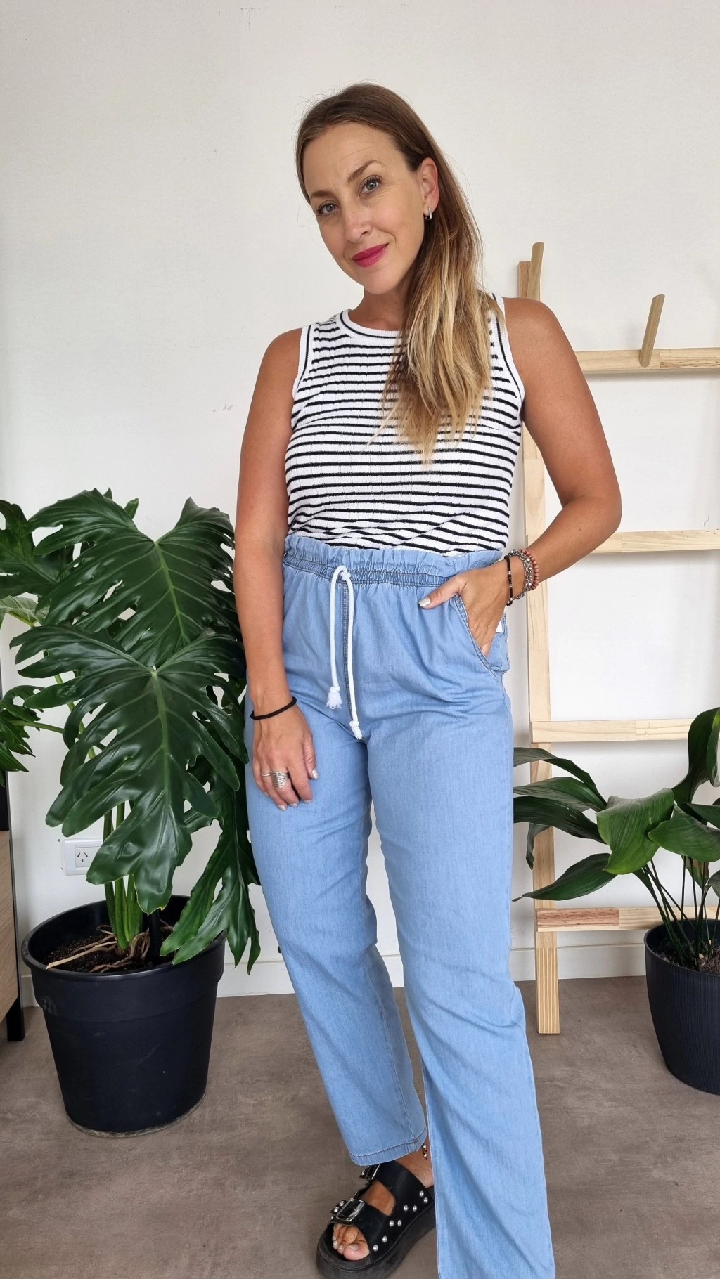 Descubrí la babucha de jean finito con elastico en la cintura, una prenda imprescindible para quienes buscan un equilibrio perfecto entre comodidad y tendencia. Este modelo cuenta con bolsillos reales laterales y traseros, brindando una funcionalidad práctica sin sacrificar el estilo.