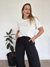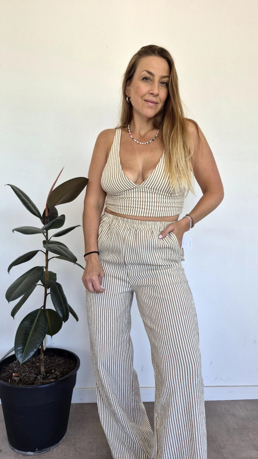Descubrí nuestro Palazzo Santos, una prenda diseñada para quienes buscan un equilibrio perfecto entre estilo y confort. Confeccionados con un tejido de muselina rayada. Estos pantalones cuentan con bolsillos laterales reales que te permitirán llevar tus esenciales con facilidad sin sacrificar la elegancia, y elstico en la cintura para mayor comodidad